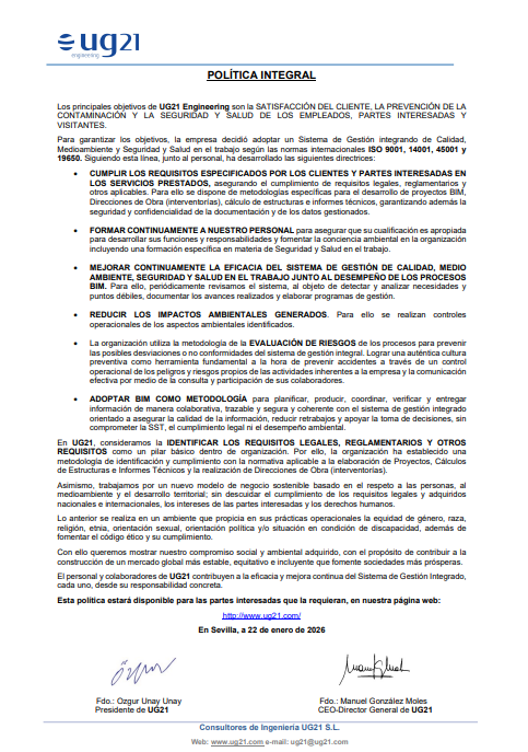 Consultores de Ingeniería UG21 S.L. fomenta la organización, sostenibilidad y el respeto ambiental, reflejándolo no solo en las medidas tomadas en cada uno de sus proyectos sino en el funcionamiento diario de la empresa, apostando por la formación continua y el compromiso ambiental de cada uno de sus miembros. Desde 2003, contamos con los certificados del Sistema de Gestión de Calidad y Medio Ambiente y más recientemente, hemos obtenido los certificados de Seguridad y Salud en el Trabajo.